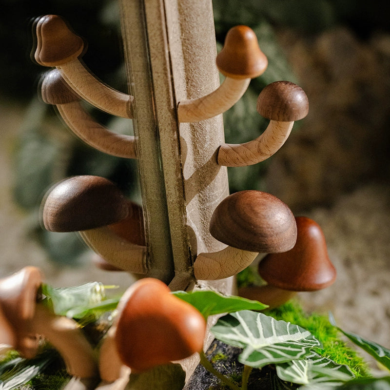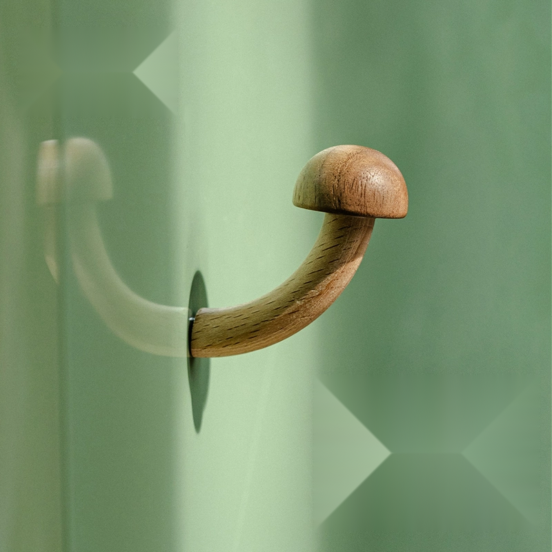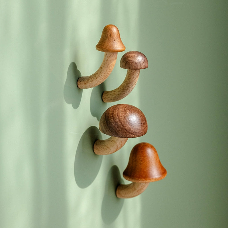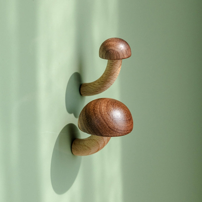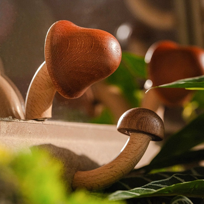 Each piece features a walnut or red sandalwood cap paired with a beech stem, hand-finished to a smooth touch. A strong built-in magnet holds notes and photos securely while the warm wood tones create a tiny “mushroom forest” on any metal surface. Mix colors and sizes to style your own set.